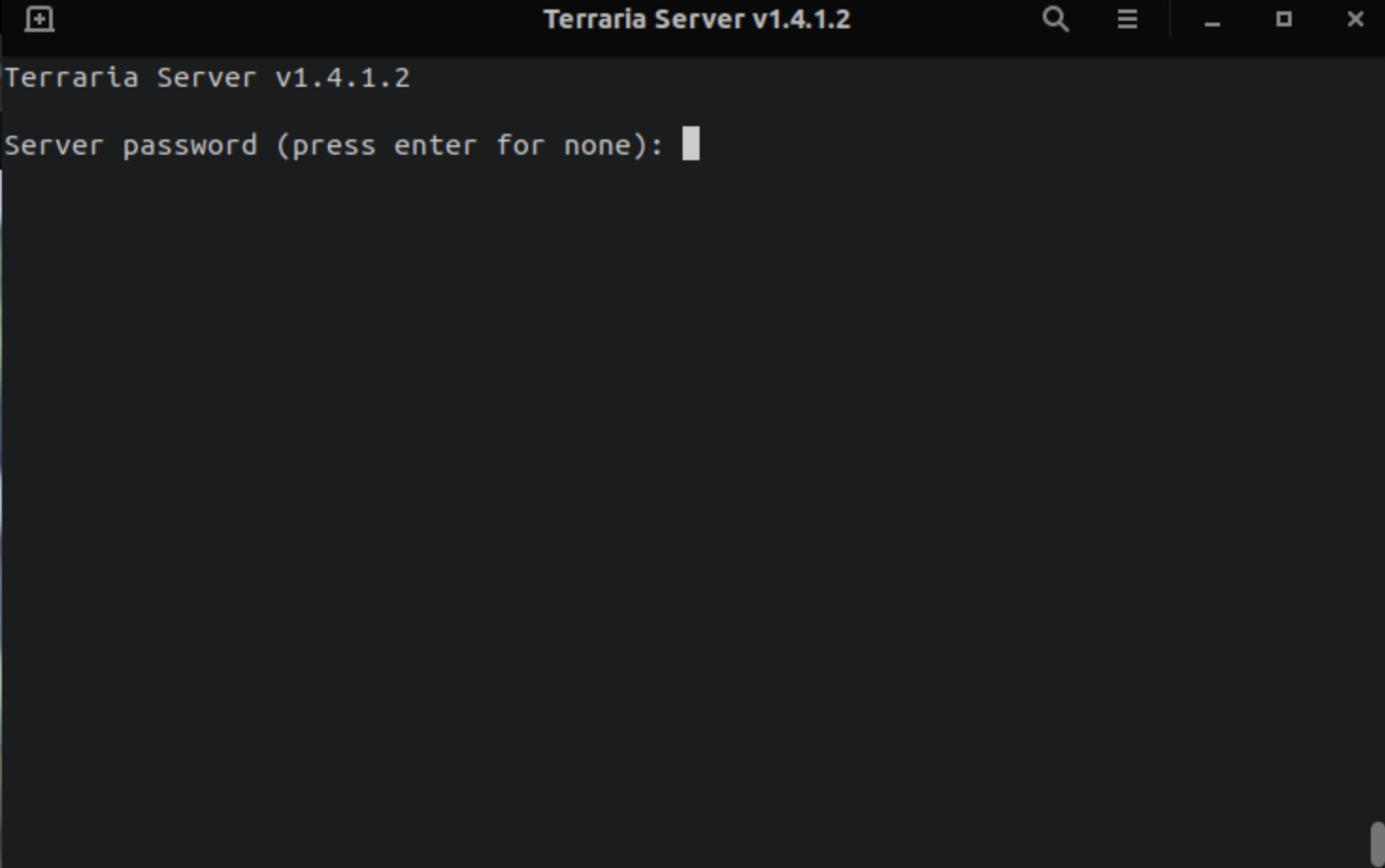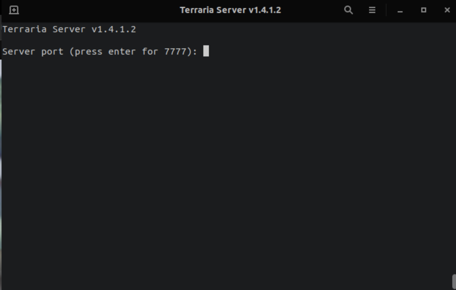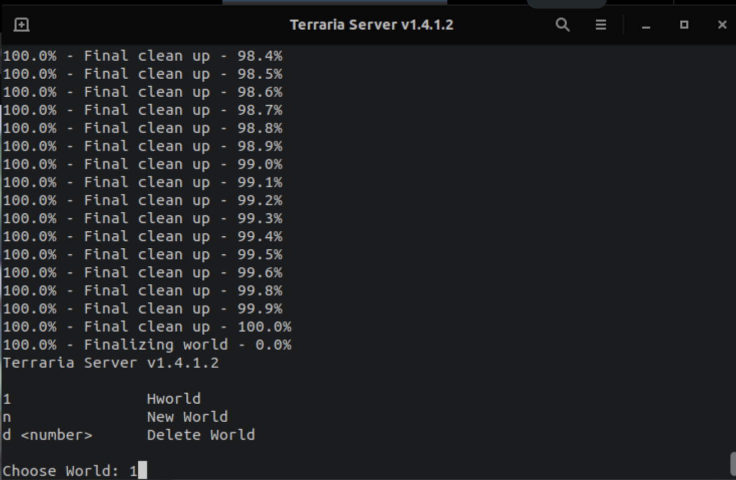 ~/.local/share/Terraria/Worlds/The screenshot above lists the new world I created "Hworld". To create your own type "n" and it will prompt you for a name and difficulty level.